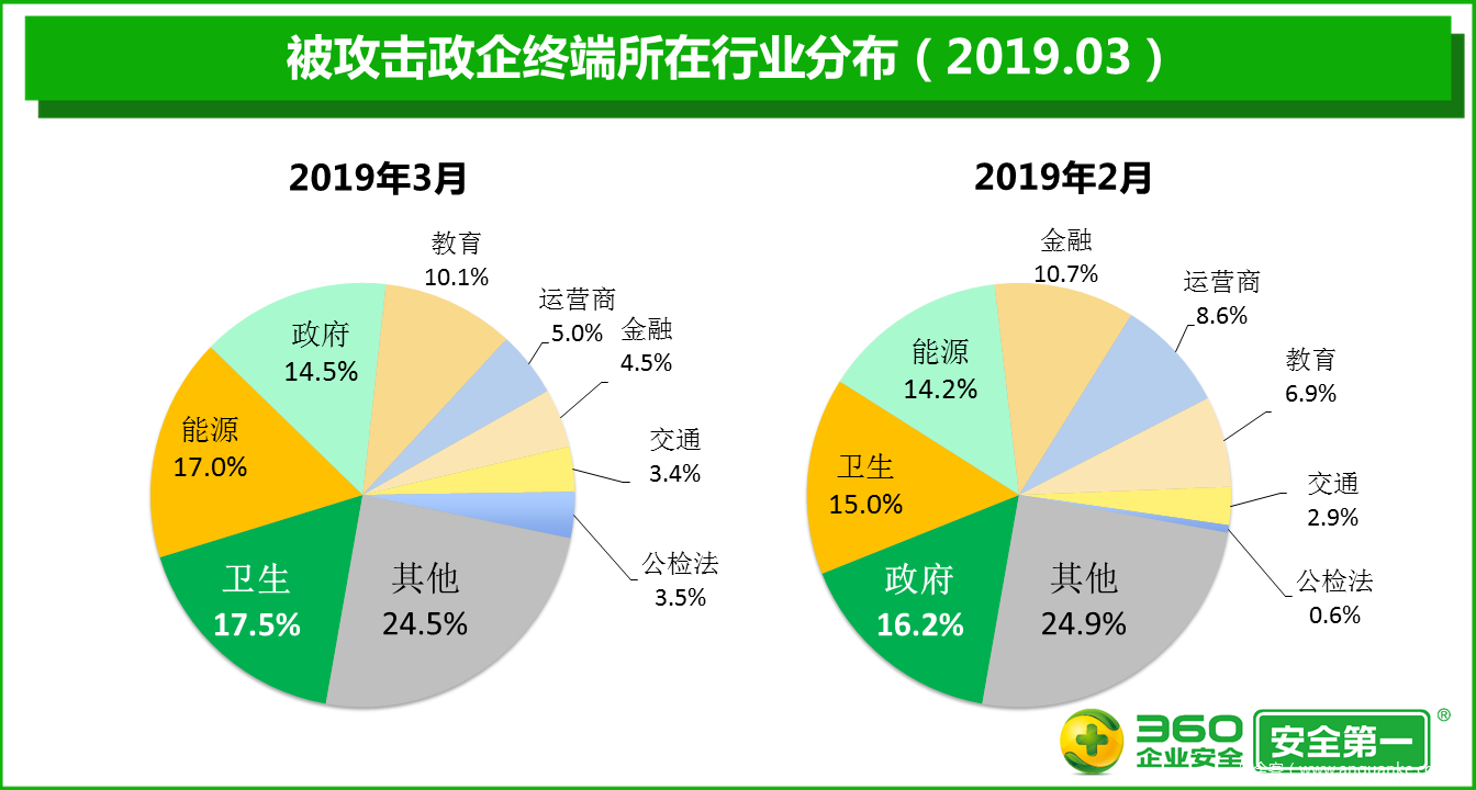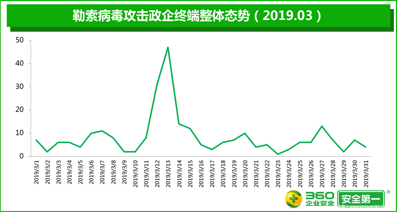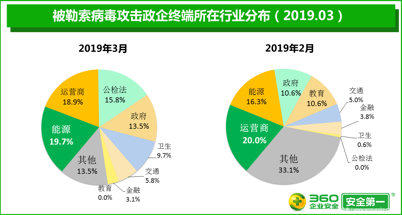 360终端安全实验室监测数据显示,2019年3月,政企单位被勒索病毒攻击的事件数量比2月增加19.8%,被勒索病毒攻击的政企终端的累计数量比2月增加61.9%,被勒索病毒攻击的政企单位的绝对数量比2月增加32.4%。
