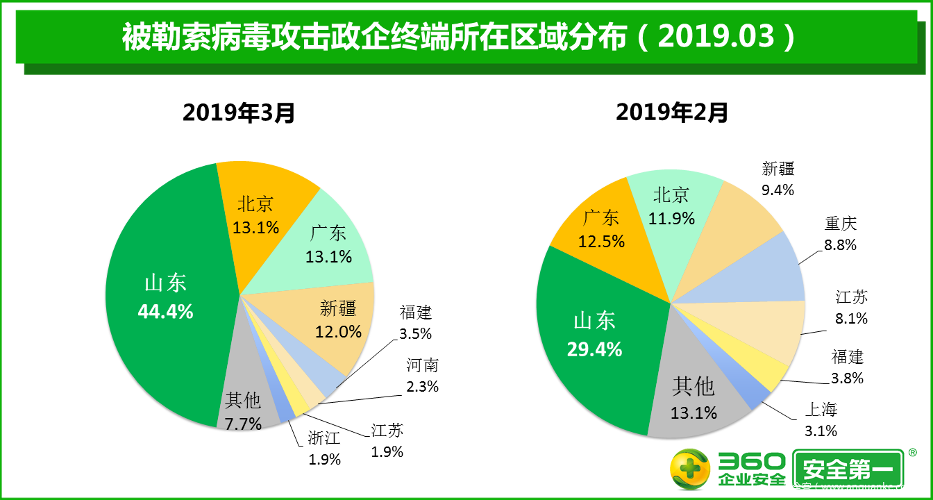 在被勒索病毒攻击的政企终端中,山东地区最多,占比高达44.4%,被攻击终端的累计数量比2月增加144.7%;其次是北京和广东,占比均为13.1%,被攻击终端的累计数量比2月分别增加78.9%和70.0%。