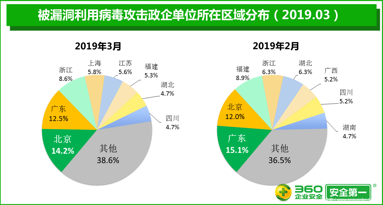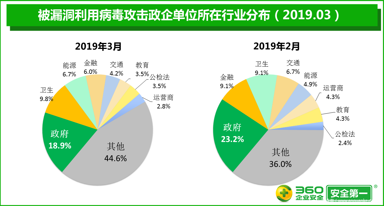 360终端安全实验室监测数据显示,2019年3月,政企单位被漏洞利用病毒攻击的事件数量比2月增加92.9%,被漏洞利用病毒攻击的政企终端的累计数量比2月增加124.4%,被漏洞利用病毒攻击的政企单位的绝对数量比2月增加73.8%。