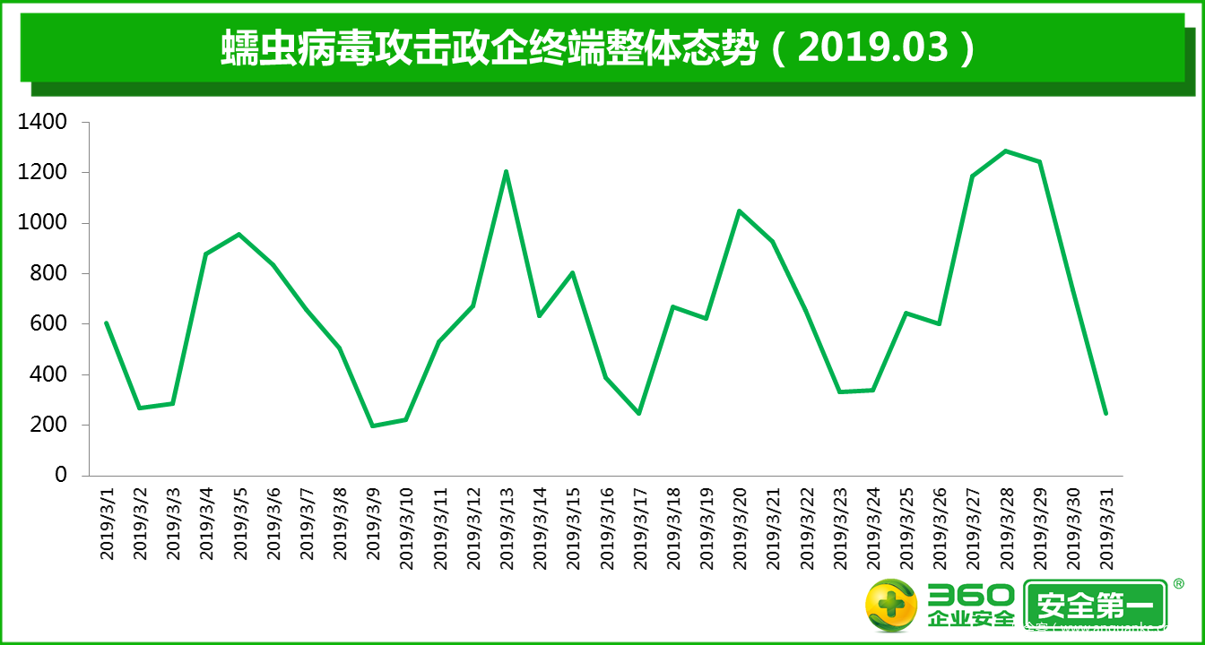 2019年3月,病毒攻击的最高峰出现在3月13日(星期三),最低谷则出现在3月9日(星期六)。