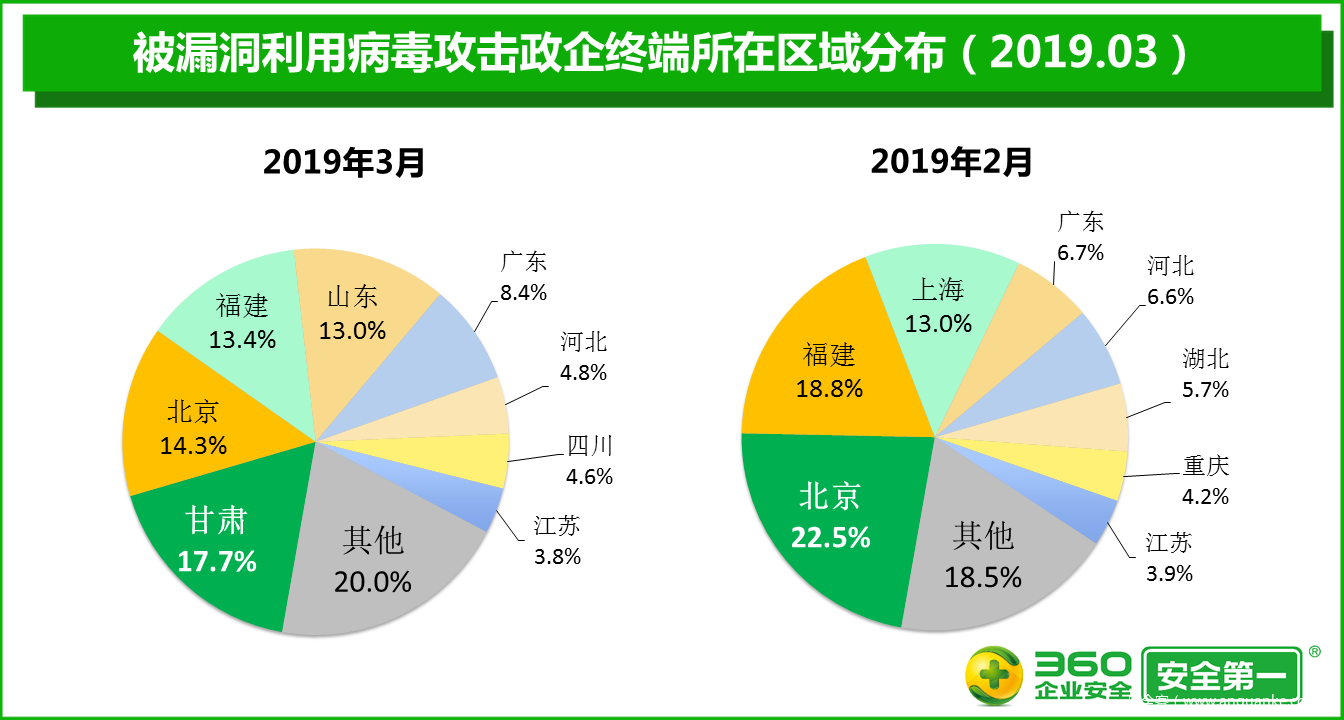 在被漏洞利用病毒攻击的政企终端中,甘肃地区最多,占比高达17.7%,被攻击终端的累计数量比2月增加139倍;其次是北京,占比为14.3%,被攻击终端的累计数量比2月增加40.9%;福建排在第三位,占比为13.4%,被攻击终端的累计数量比2月增加58.8%。