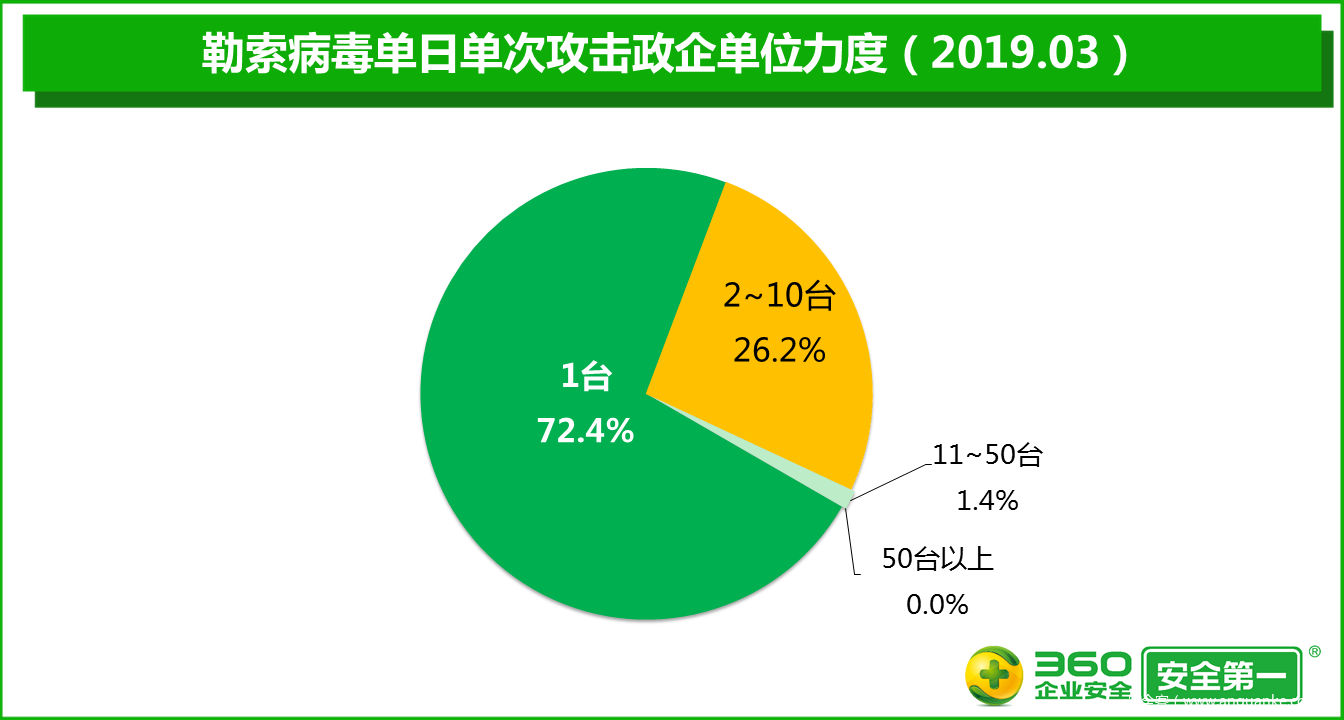 2019年3月,被勒索病毒攻击的事件数量比2月增加19.8%。其中,单日单次攻击政企单位的终端数仅为1台的事件比2月增加15.4%,占3月勒索病毒攻击事件总数的72.4%;单日单次攻击终端数为2~10台的事件比2月增加26.7%,占3月勒索病毒攻击事件总数的26.2%;单日单次攻击终端数为11~50台的事件占3月勒索病毒攻击事件总数的1.4%;没有监测到单日单次攻击终端数超过10台以上的事件。