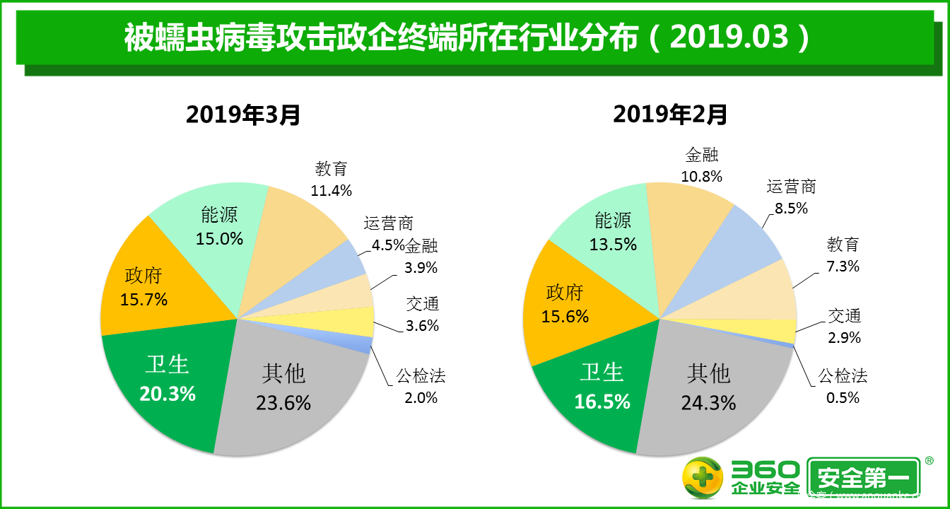 在被蠕虫病毒攻击的政企终端中,卫生行业最多,占比高达20.3%,被攻击终端的累计数量比2月增加65.1%;其次是政府行业,占比为15.7%,被攻击终端的累计数量比2月增加36.1%;能源行业排在第三位,占比为15.0%,被攻击终端的累计数量比2月增加49.9%。