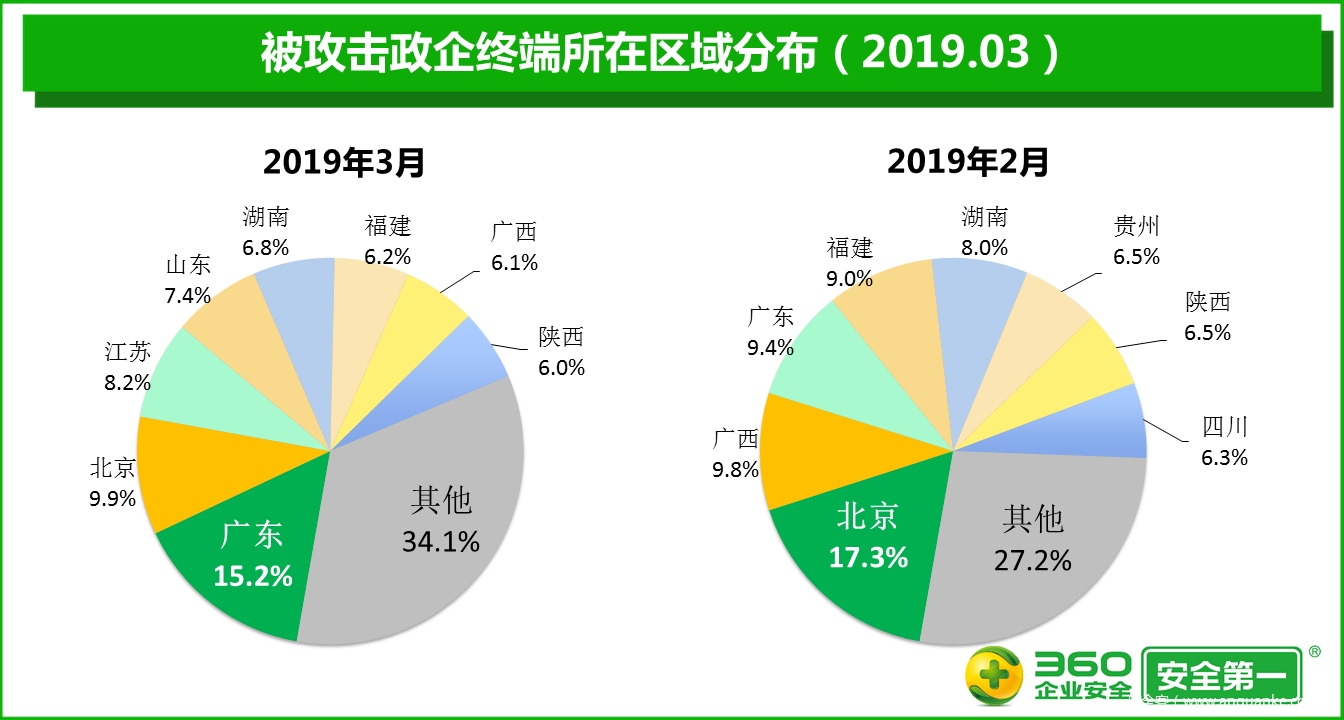在被病毒攻击的政企终端中,广东地区最多,占比高达15.2%,被攻击终端的累计数量比2月增加134.5%;其次是北京,占比为9.9%,被攻击终端的累计数量比2月减少17.6%;江苏排在第三位,占比为8.2%,被攻击终端的累计数量比2月增加236.5%。