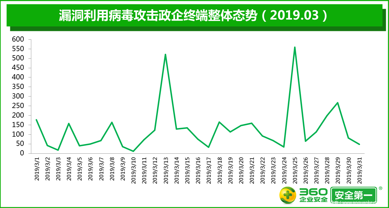 2019年3月,漏洞利用病毒攻击的最高峰出现在3月25日(星期一),最低谷则出现在3月10日(星期日)。