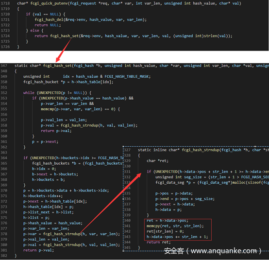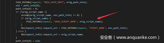 由于path_info可控,通过将指针地址归零,从而将_fcgi_data_seg结构体中的pos指针归零,控制FCGI_PUTENV函数的结果: