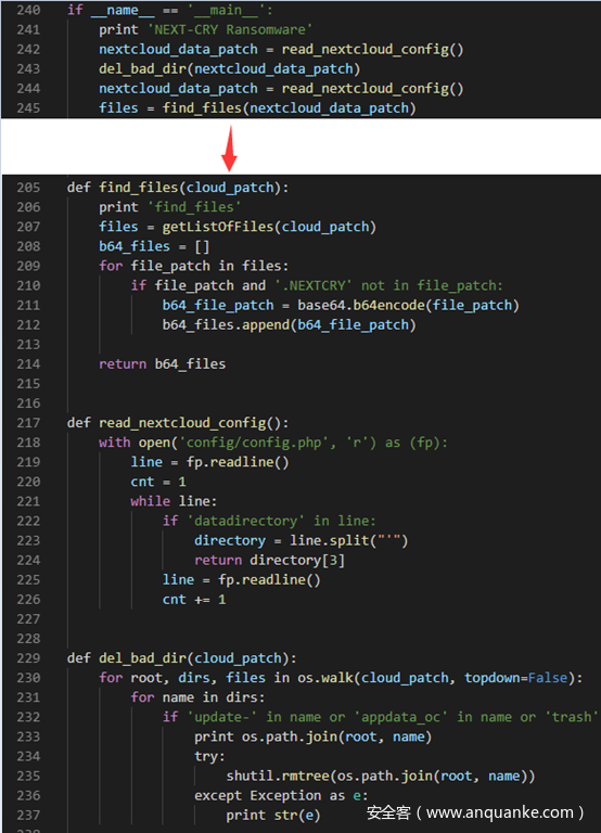 通过对PyInstaller解出来的pyc进行反编译后得到了勒索的源代码,从mian函数中可以看出,一旦入侵成功之后,便会读取nextcloud的配置文件来搜索Nextcloud文件共享并同步数据目录