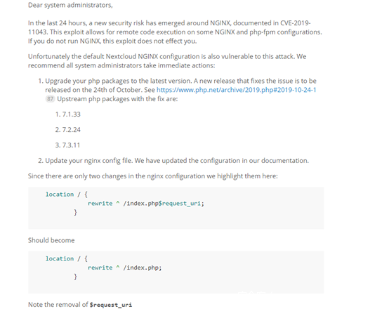 CVE-2019-11043是一个十月底刚被披露出来的PHP相关漏洞,相应的技术细节已经公开,利用此漏洞可以非常简单稳定在受影响的服务器上远程执行任意命令,在启用PHP-Fpm的Nginx服务器上运行某些版本的PHP 7有可能受到攻击。没有运行Nginx服务器理论上则不会产生影响,但值得关注的是Nextcloud软件默认情况下开启Nginx服务器,所以几乎所有的基于Nextcloud的云盘都会受到影响,这或许是攻击者选择Nextcloud的原因,Nextcloud官方在第一时间已经发布公告。