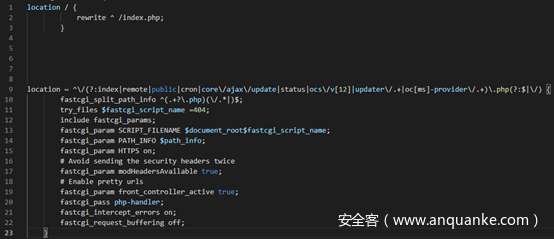 奇安信威胁情报中心目前已经检测到有用户中招,请网站管理员更新PHP软件包并更新Nginx配置文件,将相关项改为: