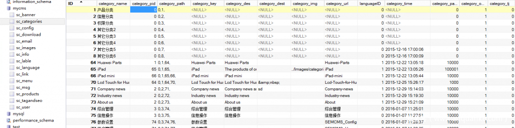 从上面的sql语句中,可以知道$table是一个表的名字。所以这里的sc_categories是一个表,看看这个表里面有什么