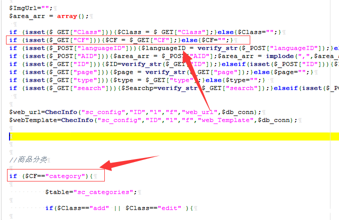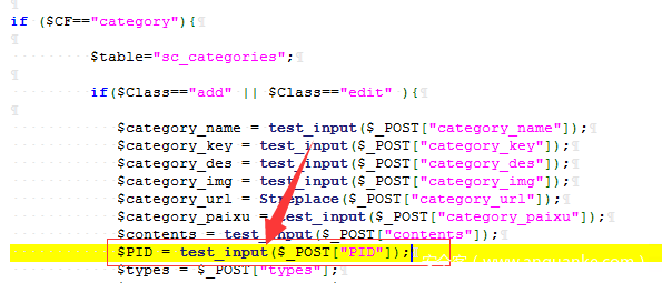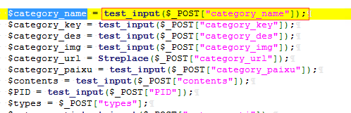 可以看出这个是一个可以通过POST传参控制的值,猜想这里可不可能存在sql注入,发现sql语句中用了带引号闭合,且在POST传参数调用了test_input函数,所以这里这里可以跳过,现在目的是让他继续执行后面的语句,所以不能让这个sql语句查询出来数据,所以只需要给 $category_name通过POST传一个 sc_categories表中 category_name字段中不存在的数据,这里拿小本本记一下, POST传参category_name且数据库中没有的数据