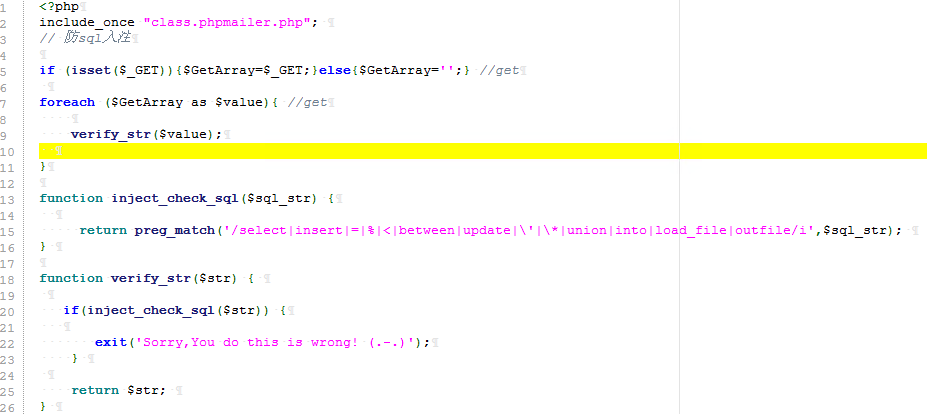在文件/Include/contorl.php的第5行-第26行中将所有GET请求中的传参过滤,同时定义了verify_str()函数,当调用这个函数时,会对字符串进行正则匹配,当匹配成功时,执行exit()