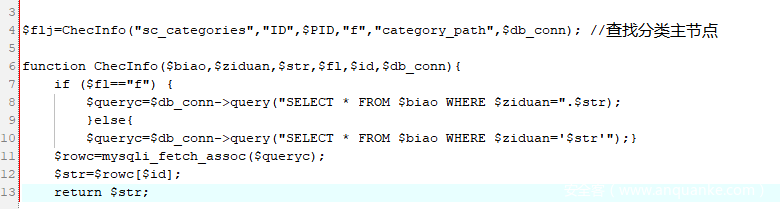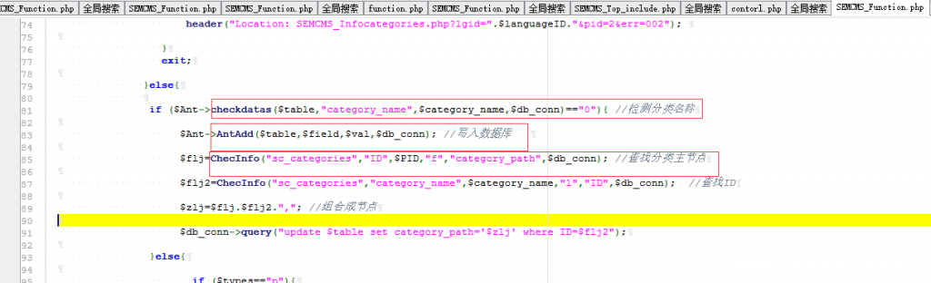 第二处SQL注入在SEMCMS_Function.php的第81行到92行,我们看到了这个地方有三个自定义函数