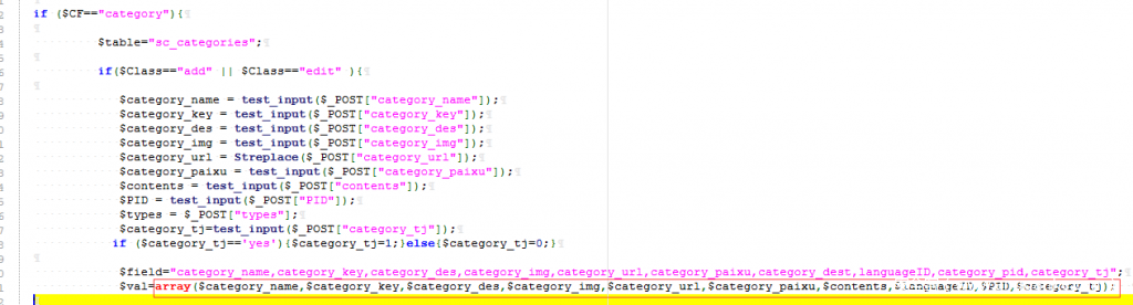 创建一个名为$val的数组看到有个熟悉的变量$category_name,也就是我们上面的传参会被写入数据库,OK继续看看下一个函数