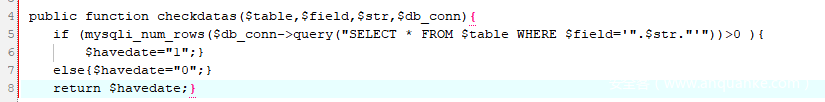 这段代码作用是将变量$str放进sql语句中并执行,返回查询出来的数量,如果查询出来的记录条数大于0,返回1,如果没有记录,则返回0。由于调用这个函数的位置在if语句中,且条件等于0才能继续执行后面的语句,就不能让sql语句查询出记录if ($Ant->checkdatas($table,”category_name”,$category_name,$db_conn)==”0″){