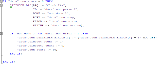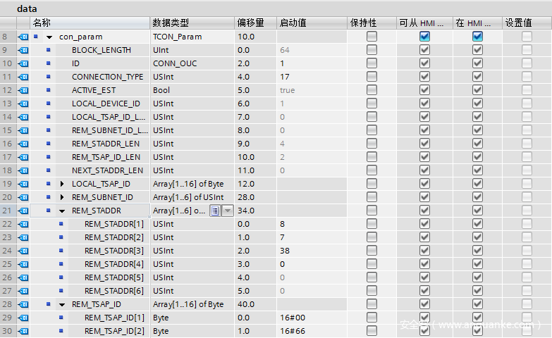 在源PLC中的正常逻辑程序中加了一段IP扫描和建立TCP连接的代码,通过IP地址和端口号寻找目标PLC。这段代码中调用了西门子的两个系统函数TCON和TDISCON。TCON用来设置并建立TCP通信连接,参数CONNECT在这段程序中起很重要的作用,它是TCOM_PARAM数据类型的变量,我们主要需要配置ID(ID号可任意,但与其相关通信的都必须采用此ID号),CONNECT_TYPE:17,ACTIVE_EST:1(表示主动建立连接),LOCAL_TASP_ID,REM_TASP_ID:102(必须为102,表示为被连接的PLC的端口地址),REM_STADDR(IP扫描的起始地址)。我们为”data”.con_state设定初值为10,当PLC启动便会执行TCON去建立连接,当TCON函数的参数done为1表示已发现目标PLC并建立了TCP连接,然后进入到下一个过程状态(下一个状态我们定义为”data”.con_state=20,用于建立S7+通信连接)。否则执行TDISCON删除所设置的相应连接,同时IP地址加一,继续扫描直至找到目标。关于CONNECT参数,我们专门把它定义在一个data数据块中,以便于参数赋初值,如图所示: