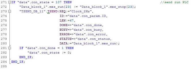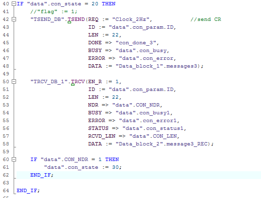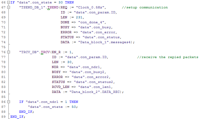 在我们的SCL程序反复多次调用了TSEND函数以及两次调用TRCV函数,因为会进行建立S7+连接、停止PLC、下载功能块、启动PLC等多个状态的转换,而每个状态过程实现需发送相对应的message。TSEND函数的作用是通过现有通信连接发送数据,发送数据需要在参数DATA指定发送区。也就是说引用指向发送区的指针,该发送区包含要发送数据的地址和长度,在该程序中我们的地址引用为数据块。TRCV函数的作用是通过现有通信连接接收数据,函数中参数EN_R 设置为值“1”时,才会启用数据接收。发送及接收协议message的程序如下图: