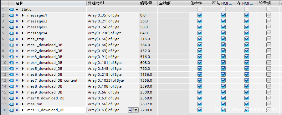 上一节提到的方法是搜索目标PLC,搜索到目标PLC后又如何将恶意代码传输给目标PLC,在s7-1200的编程软件中采用系统函数TSEND/TRCV实现PLC之间的数据传输,如建立S7连接、启/停PLC、数据块下载等,当然S7-1200是基于S7+协议,即将S7+的数据字段通过在s7-1200的编程软件用数组的方式组织起来,例如在源plc用一个DB数据块建立一个特定长度的message,用于存储特定功能的S7+数据字段,再通过TSEND函数发送给目标PLC。但我们需要事先定义好状态机,到某一个状态时TSEND函数的DATA参数指向特定的message,也就是说到不同的状态发送不同message。特定的message我们可以通过wireshark抓包分析得到,然后把它定义在指定的DB块中(创建一个数据类型为BYTE的数组,在启动值处输入必要的16进制码)。如下图: