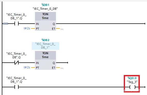 使用TIA连接PLC可以很明显可以看出PLC中程序发生了变化,被注入了一个组织块OB6666(OB6666中的内容为我们编写的恶意程序)以及两个DB数据块。恶意程序可以操纵PLC的输出,我们实现的是让某个DO输出循环地开启2S后关闭2S。下图为我们操纵PLC输出的程序,展示的被操纵的数字量输出Q0.0: