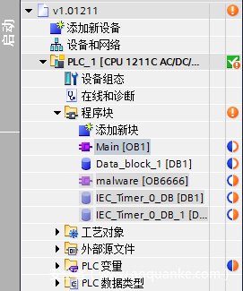 这样OB块和运行所需的DB块被注入,PLC将自动检测到新增的OB块并按照程序的逻辑进行运行,原有的逻辑功能不会受到影响,只是额外执行了某种任务而已。以下图片展示了PLC被感染蠕虫前后的项目树对比情况: