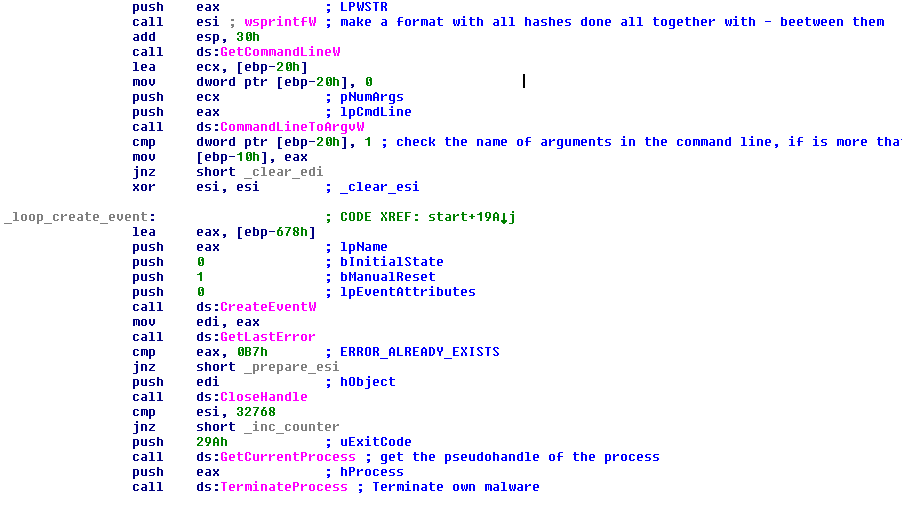 在尝试创建事件后,恶意软件将使用GetLastError函数检查最后一个错误,并将其与ERROR_ALREADY_EXISTS (0xB7)进行比较。如果事件已经存在,则恶意软件将检查计数器的值是否为0x8000 (32768)。如果不是该值,则会将计数器加一,然后再次尝试创建该事件,并检查最后一个错误,以此类推,直到其最终达到该值,或者达到计数器中的最大值(64233)。如果无法创建事件,则恶意软件将使用GetCurrentProcess函数,将伪句柄移动到自身的进程,随后使用函数TerminateProcess将其终止,并返回错误代码0x29A。