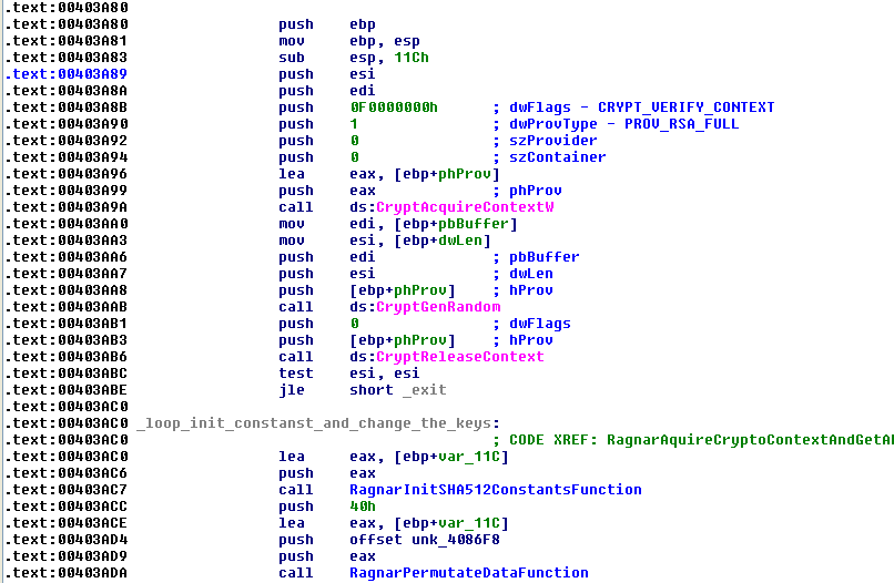 随后,恶意软件将准备密钥,后续将使用该密钥对文件进行加密。为此,它将使用函数CryptAquireContextW获取加密的上下文,该函数将使用CryptGenRandom生成随机数据,并使用SHA-512算法替换该值。这些值是Salsa20算法的密钥和随机数,将在以后用于加密文件。