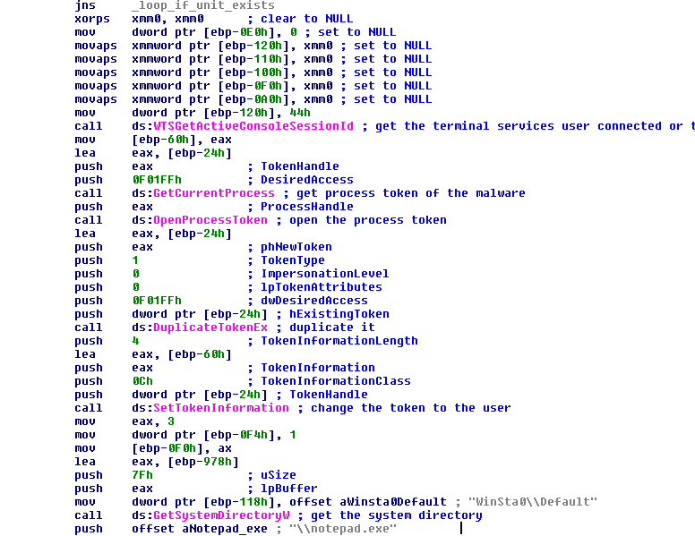 在结束所有加密线程之后,恶意软件尝试获取终端服务会话,或使用WTSGetActiveConsoleSessionId函数登录本地计算机的用户会话。在这个会话中,恶意软件会使用GetCurrentProcess函数获取恶意软件的当前进程,并使用OpenProcessToken函数获取该进程的令牌。对于先前获得的会话,它尝试使用DuplicateTokenEx函数来复制令牌,并使用SetTokenInformation函数设置为这个令牌。之后,将使用GetSystemDirectoryW函数获取系统目录,并将字符串notepad.exe连接到该路径后面。