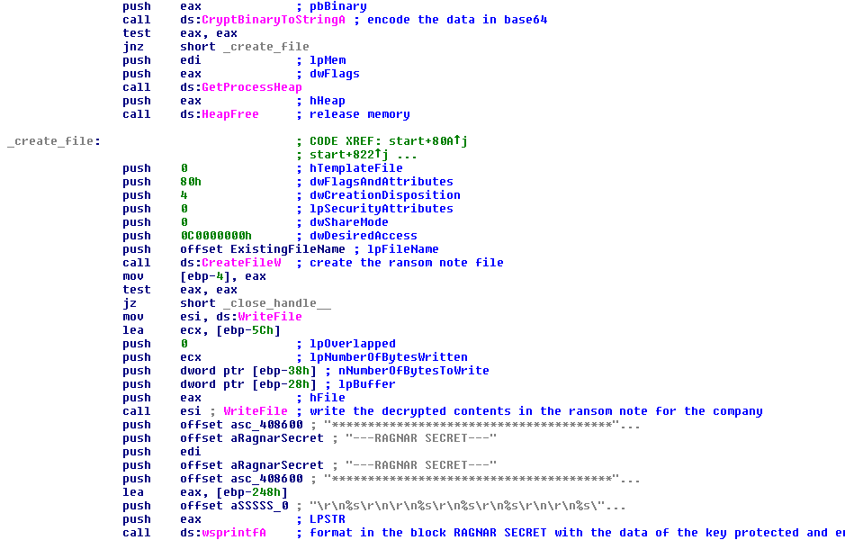 在其他情况下,恶意软件将会对文件进行加密,并在文件末尾写入密钥的加密块(256字节)、随机数(256字节)和“RAGNAR”标记,最后以一个NULL字符结尾(9字节)。在Salsa20算法中使用的密钥和随机数由嵌入在恶意软件中的RSA公钥进行加密。这样一来,就可以确保只有恶意软件开发人员才拥有RSA私钥,并有能力解密系统中的文件。