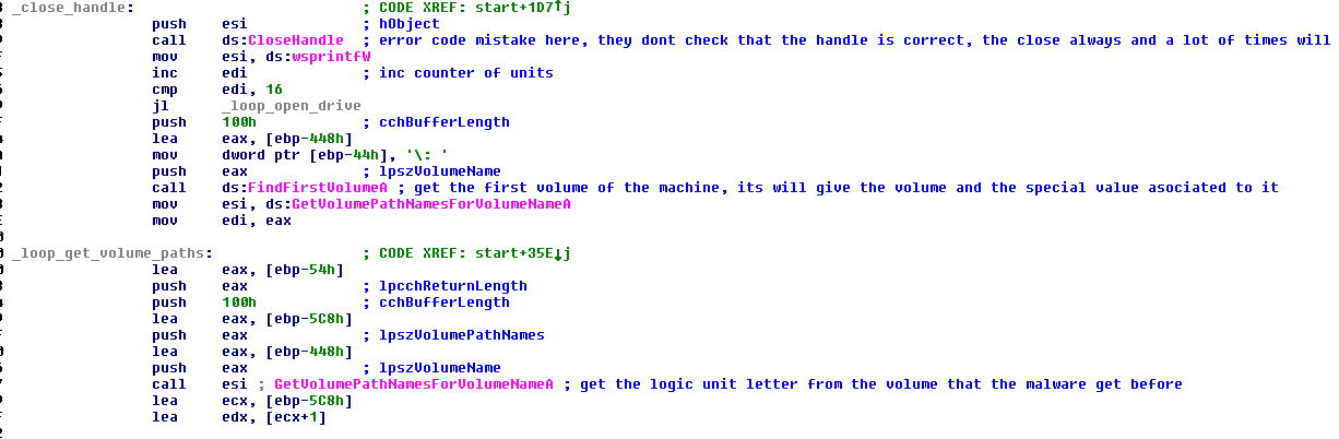 勒索软件的下一个动作是检查存在的单元,确保可以毫无问题地访问这些单元。这一过程可以通过以下两种方式来完成,第一种是使用函数FindFirstVolumeA、FindNextVolumeA和FindVolumeClose。