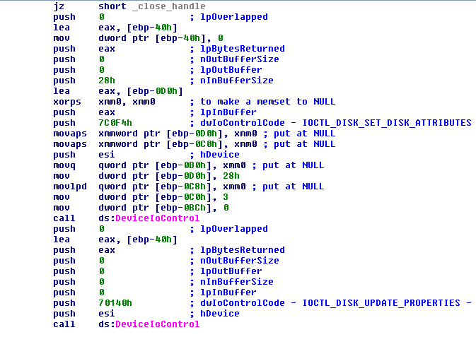 1、0x7C0F4 -> IOCTL_DISK_SET_DISK_ATTRIBUTES,其属性为DISK_ATTRIBUTE_READ_ONLY和DISK_ATTRIBUTE_OFFLINE。