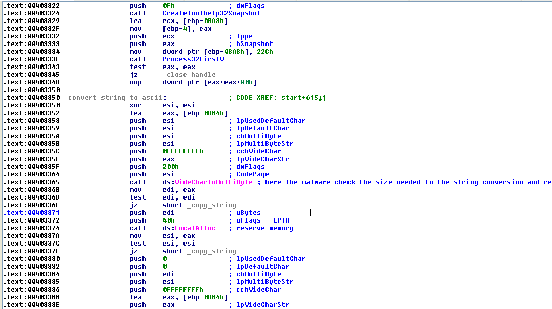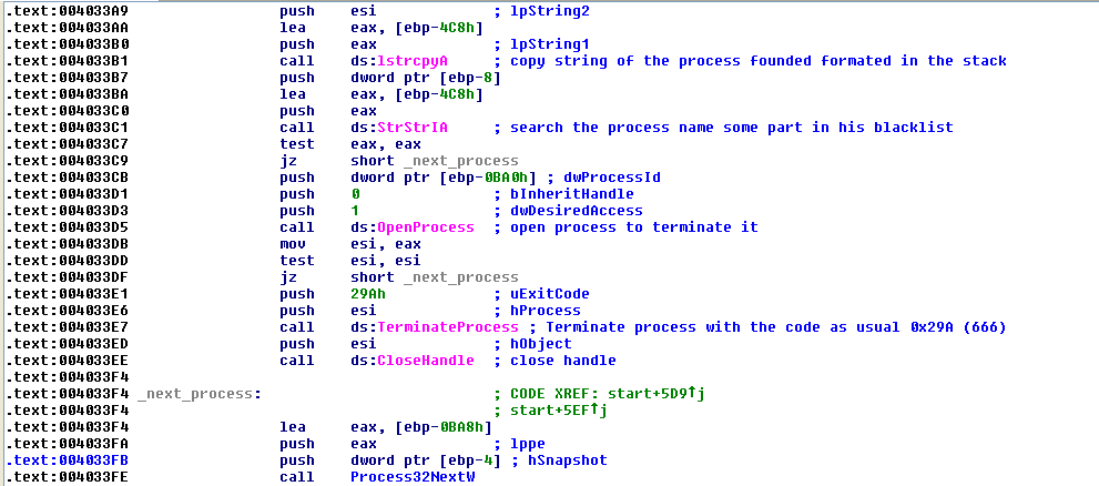 之后,该恶意软件会解密一系列进程,如果在受感染的计算机中找到它们,将会尝试终止这些进程。对于这一解密过程,恶意软件使用一个字符串,该字符串将会被转换为整数,并使用整数作为临界值来解密列表。