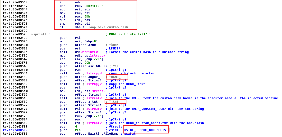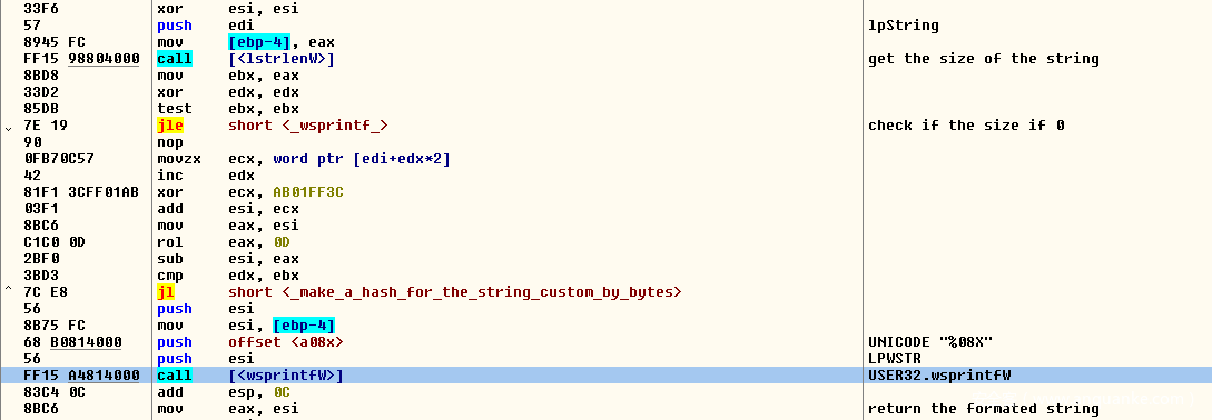 恶意软件将使用VirtualAlloc预留一些内存空间,并获取字符串的大小,在一个小循环中完成哈希值的计算。之后,它将使用函数wsprintfW对哈希值进行格式化,使其符合Unicode字符串的格式。