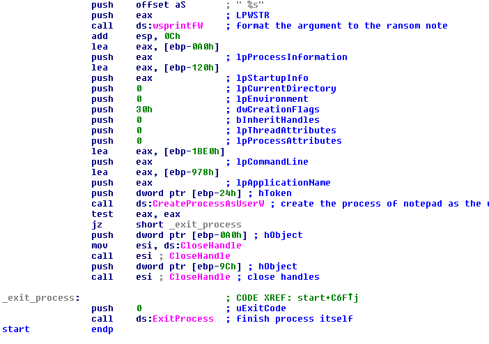 在准备好这项工作之后,恶意软件将运行记事本,并将赎金提示信息展示给用户。在这一过程,使用的函数是CreateProcessAsUserW,以模拟此前用户的会话。