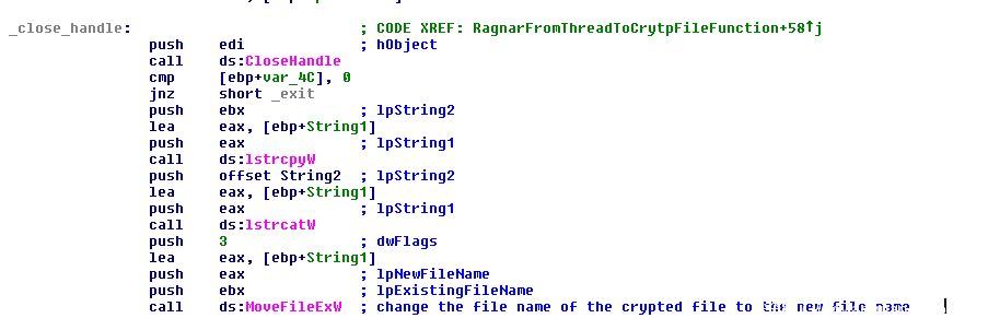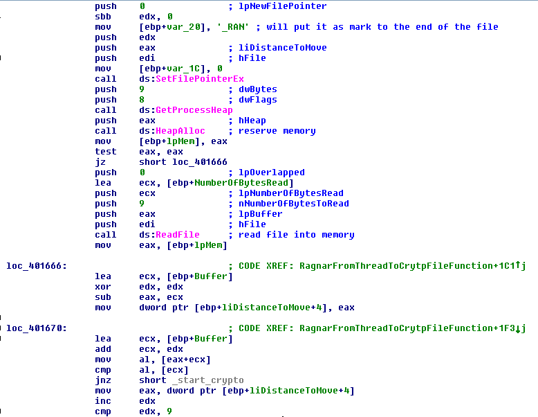 在加密进程的线程中,恶意软件通过SetFilePointerEx函数读取文件的最后9个字节,判断文件末尾是否带有“RAGNAR”标记。如果带有此标记,则该文件将会在加密过程中被忽略,并将再次对其重命名。