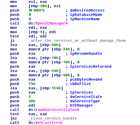 如果可以打开其句柄,则将会使用函数EnumServicesStatusA获取服务的状态,如果服务已经停止,则会传递给下一个服务。恶意软件两次调用该函数,首先是获得该函数所需的正确大小,最后一次进行错误检查的过程会使用GetLastError检查值是否为0xEA(ERROR_ALREADY_EXISTS)。如果存在该错误值,则表明应用程序需要更多的内存来填充该函数给出的所有信息。