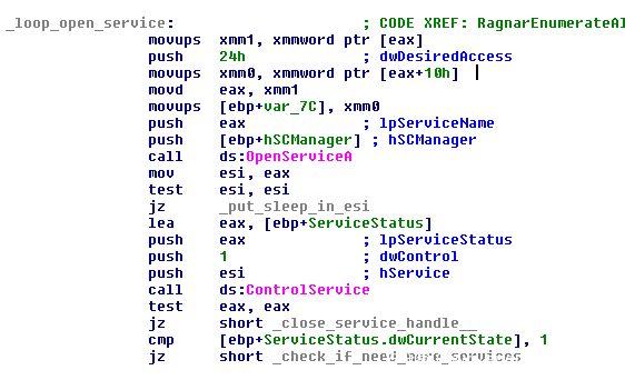 这部分内存将被保留,以便稍后再调用该函数并获取实际状态,如果不被停止,恶意软件将使用函数OpenServiceA打开服务,并使用函数QueryServiceStatusEx查询服务的状态。如果服务没有停止,它将通过EnumDependentServicesA获取该服务的所有依赖关系,最后将通过ControlService函数控制该服务使其停止。