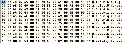 硬编码的语言包括:格鲁吉亚语、俄语、乌克兰语、摩尔达维亚语、白俄罗斯语、阿塞拜疆语、土库曼语、吉尔吉斯语、哈萨克语、乌兹别克语、塔吉克语。