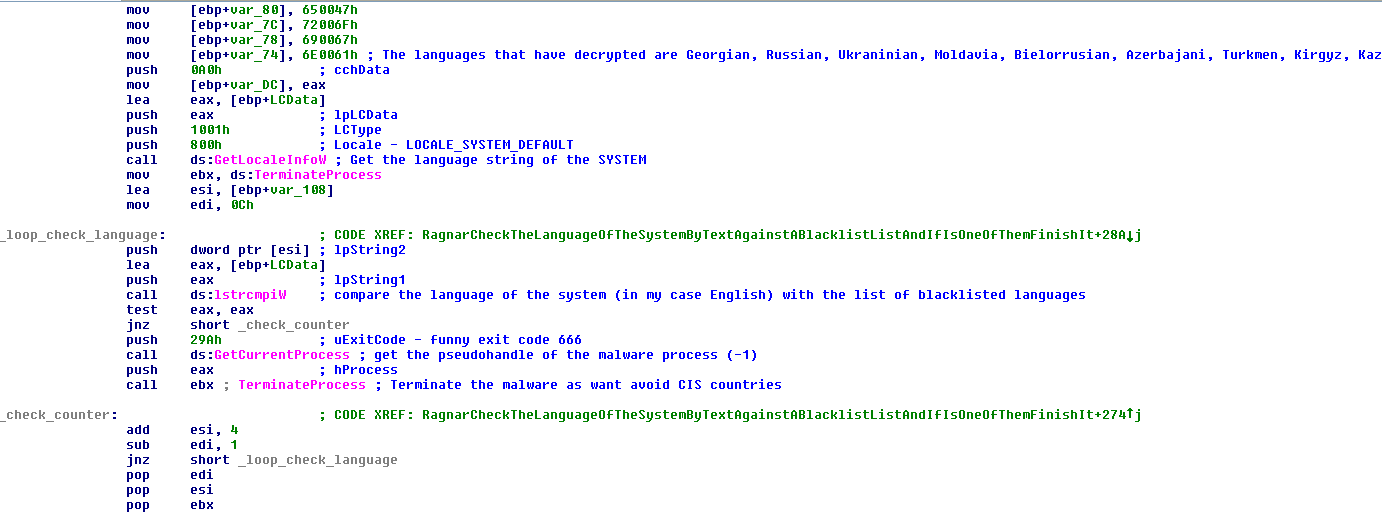 在准备这些字符串之后,恶意软件使用函数GetLocaleInfoW来获取LOCALE_SYSTEM_DEFAULT语言作为一个字符串。在获取后,它将检查系统语言是否属于黑名单中的语言,如果匹配,勒索软件将使用TerminateProcess函数来结束其自身,并返回错误代码0x29A。这样的功能,我们之前已经在许多不同的恶意软件样本中见到过。