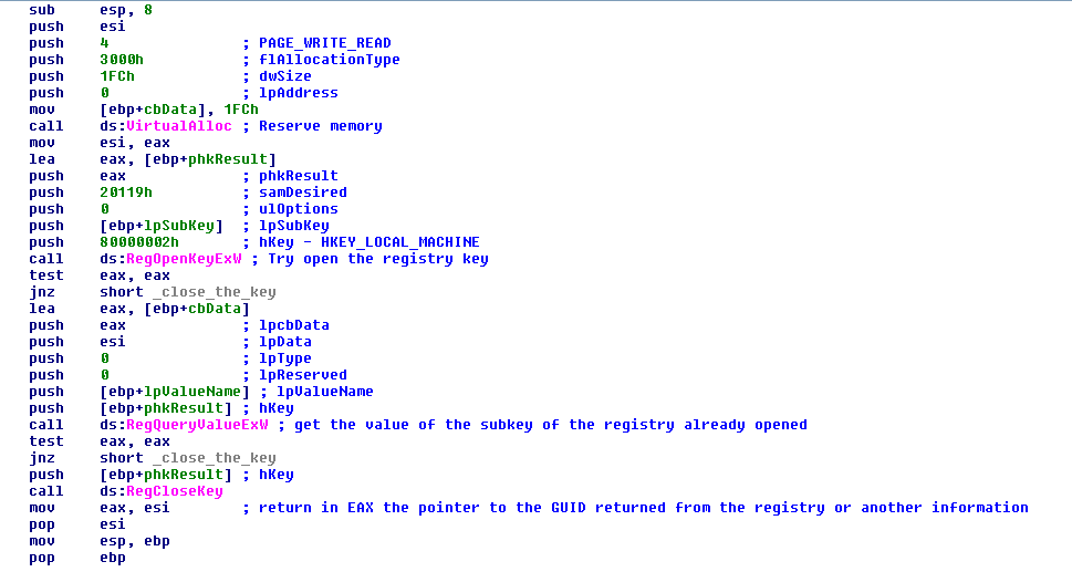 为此,恶意软件在配置单元HKEY_LOCAL_MACHINE中使用了RegOpenKeyExW、RegQueryValueExW和RegCloseKey函数,在这里无需管理员权限即可读取该配置单元。