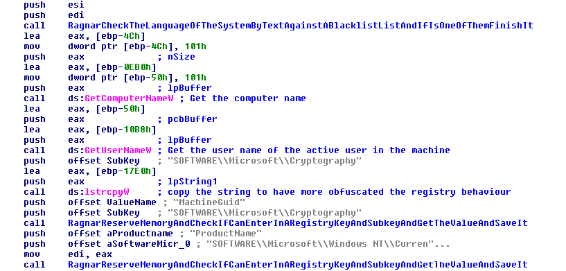 在此之后,恶意软件将使用GetComputerNameW函数获取受感染计算机的名称,并使用GetUserNameW获取当前用户的用户名。