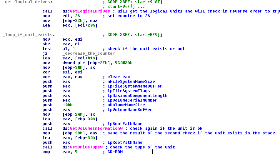 另一项检查会使用到函数GetLogicalDrives,该函数将返回结构,并通过检查一个特定字节,判断该单元是否存在。