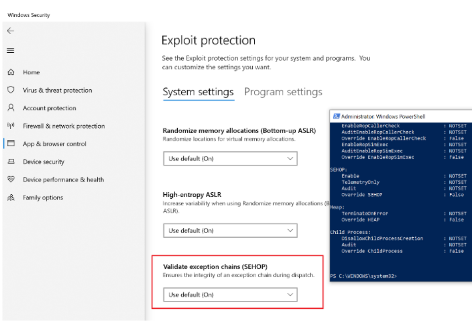 图27 来自WIndows 10上的Windows安全中心的SEHOP设置
