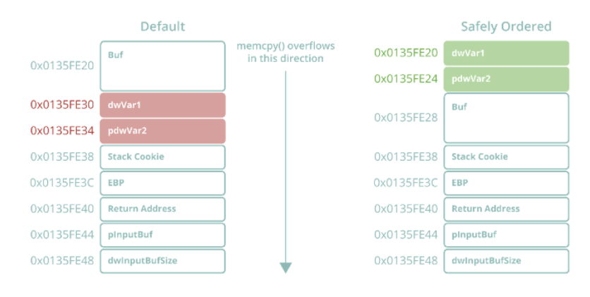 果然,我们可以看到,变量都已经按照我们预测的顺序排列,其中,C位于EBP – 4处,也就是排在第一位。尽管如此,MSVC使用的排序逻辑与我们在图30中看到的情况相矛盾。毕竟,dwVar1和pdwVar2的引用次数(各两次)都比Buf高(在memcpy中只有一次),而且都是在Buf之前引用的。那么这是怎么回事呢?GS包含了一个额外的安全缓解功能,它试图安全地对局部变量进行排序,以防止由于堆栈溢出而导致可利用的局部变量破坏。