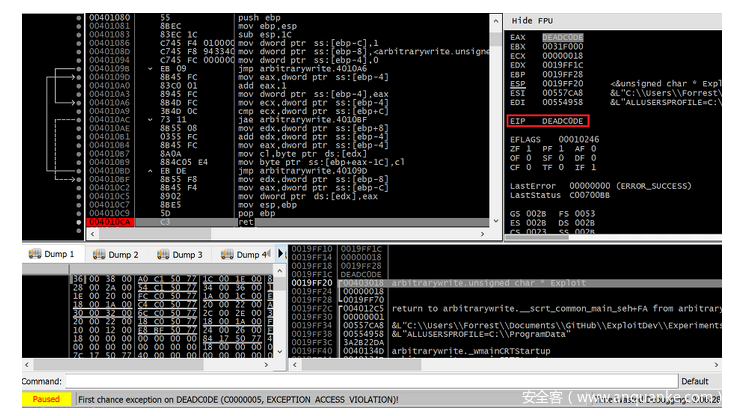 编译并执行上面的代码会导致一个没有堆栈Cookies和没有进行安全的变量排序的函数,这样的话,攻击者就可以通过精确覆盖0x0019FF1c处的返回地址来劫持EIP(在本例中,我已经禁用了ASLR)。