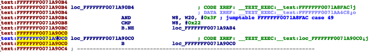 于是我在纸上记录下已知地址处的汇编指令,加载我设备的kernelcache,并跳转到KNOWN_ADDRESS + my offset guess(已知地址+我猜测的地址偏移量)处。然后在附近寻找相同的汇编指令。