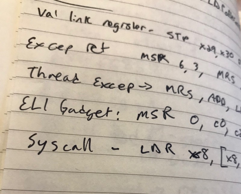 最后5个是最难找到的。我这一次的搜索并没有直接找到提示的内容。所以我开始研究我所发现的这些符号地址并试着寻找他们之间的关联。在用这些地址做一些基本的减法后,我发现他们之前隔着相同倍数的距离。这至少帮我减小了搜索的范围。我还比较了我已知的这些符号中最近的两个相距多少。例如:VALID_LINK_REGISTER和X21_JOP_GADGET之间只差0x28个字节。