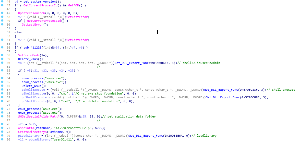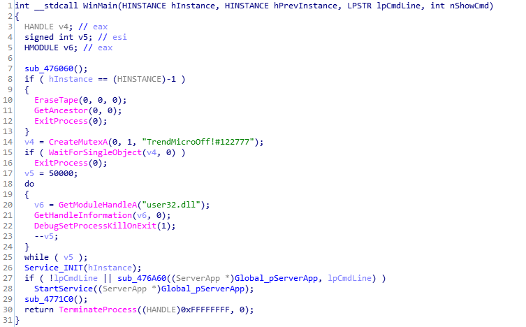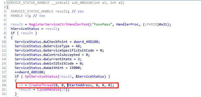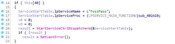Wsus.exe作为服务启动,所以样本代码中应该有一个SCManger。所以,在静态分析时找到了SCM的代码: